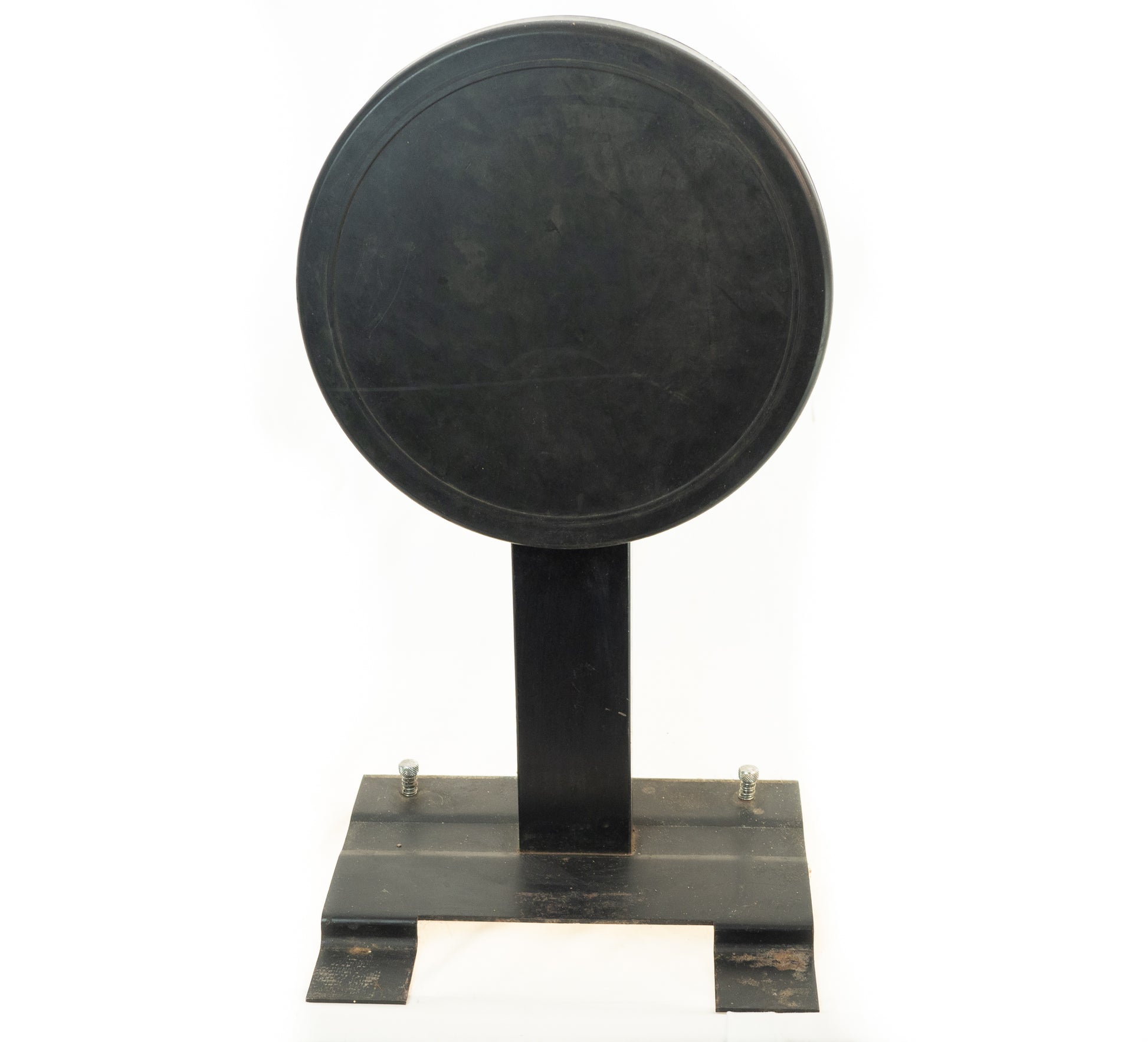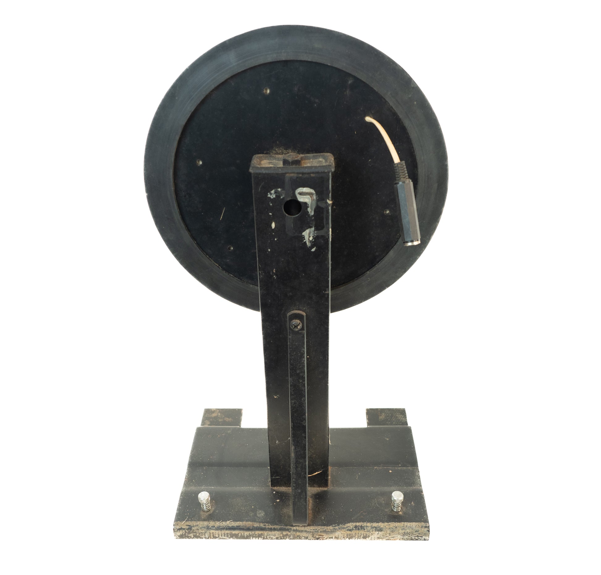 This tested, working drum pad has no brand name, but seems well built with a heavy metal frame. The height of the pad from the floor is 8" to the top edge is 18".
