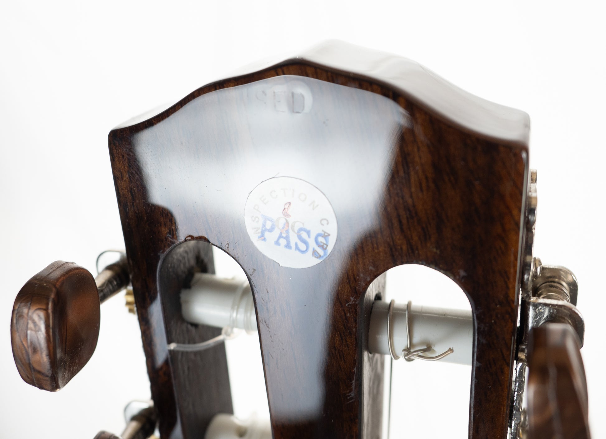 This would be a good guitar for a beginner, it has nylon strings and a narrow fingerboard. It has a nice tone and is easy to play. It comes with a hardshell case. As a refurbished instrument, it is stamped "used" on the back of the headstock to indicate that it no longer carries factory warranty.