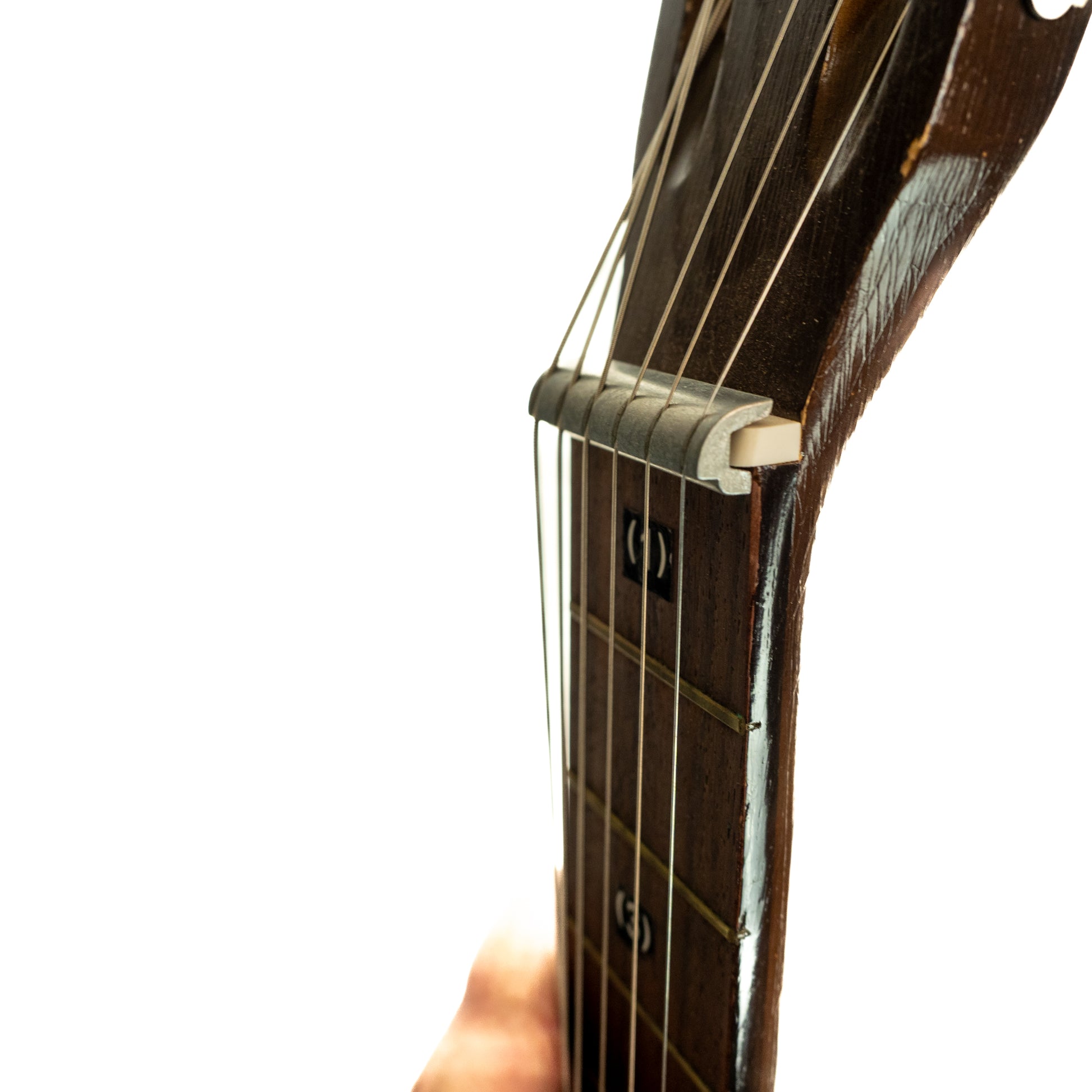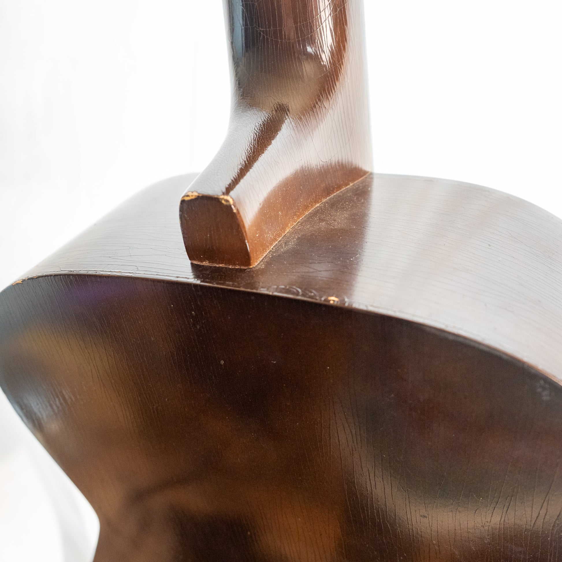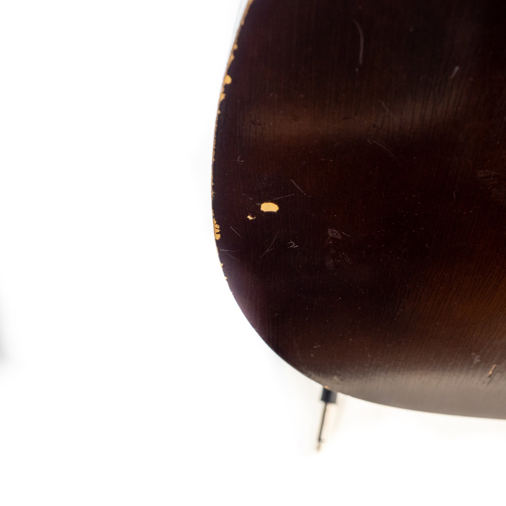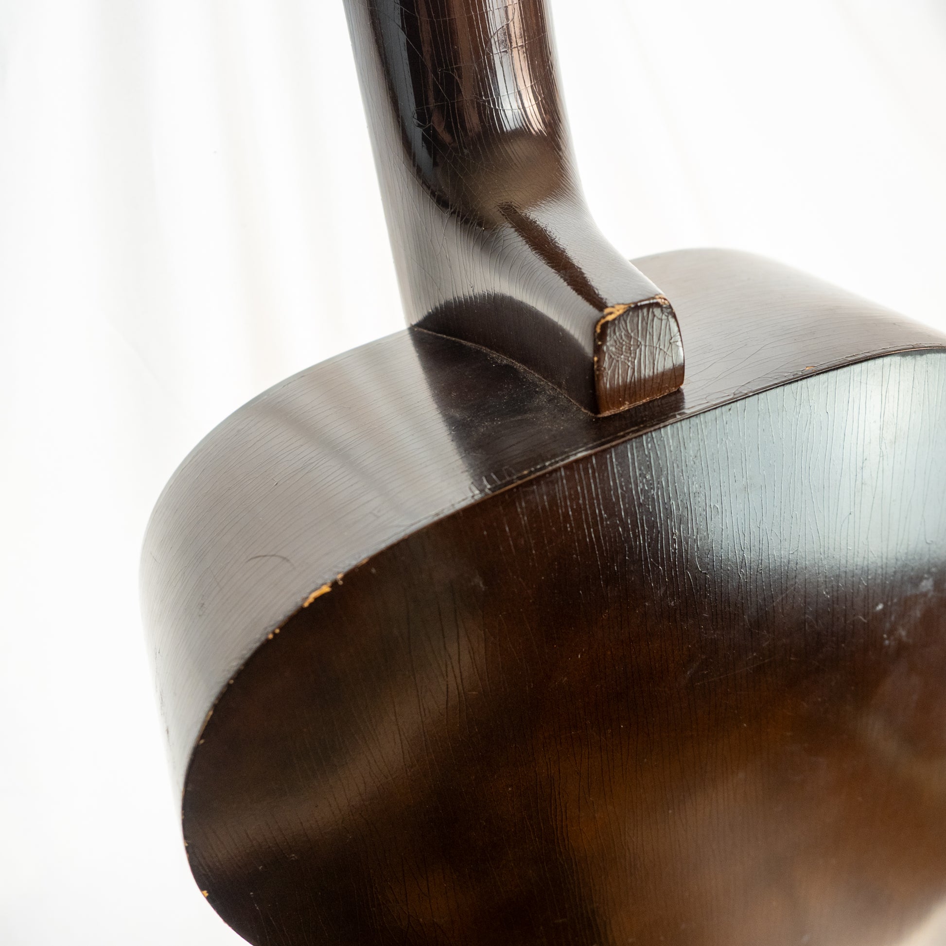 This is a fun one! The neck has a bow, so this has been converted to a slide guitar with a riser nut. It cannot be reverted to a fretted guitar. The bridge has a lift, but the fasteners are holding tension properly. It wouldn't take too much to get the bridge re-glued. The pickup is passive and has decent output. It has numerous scrapes, scratches and signs of handling. Overall, it's a handsome guitar with a nice rosette decoration and shiny top. It's fun to play and has a nice-bluesy tone. Ships in a solid soft shell case that is lightly soiled from use. Sold "AS-IS".