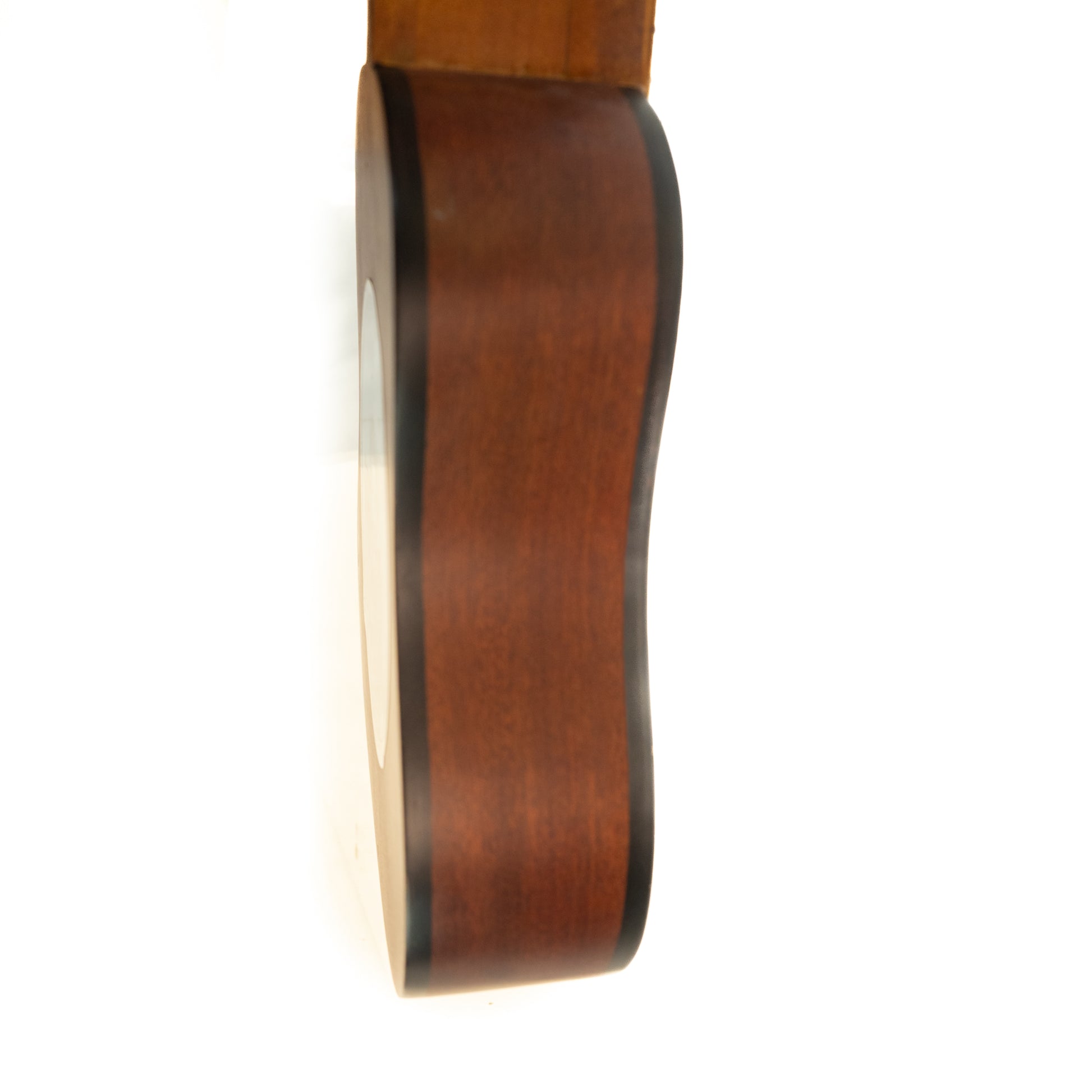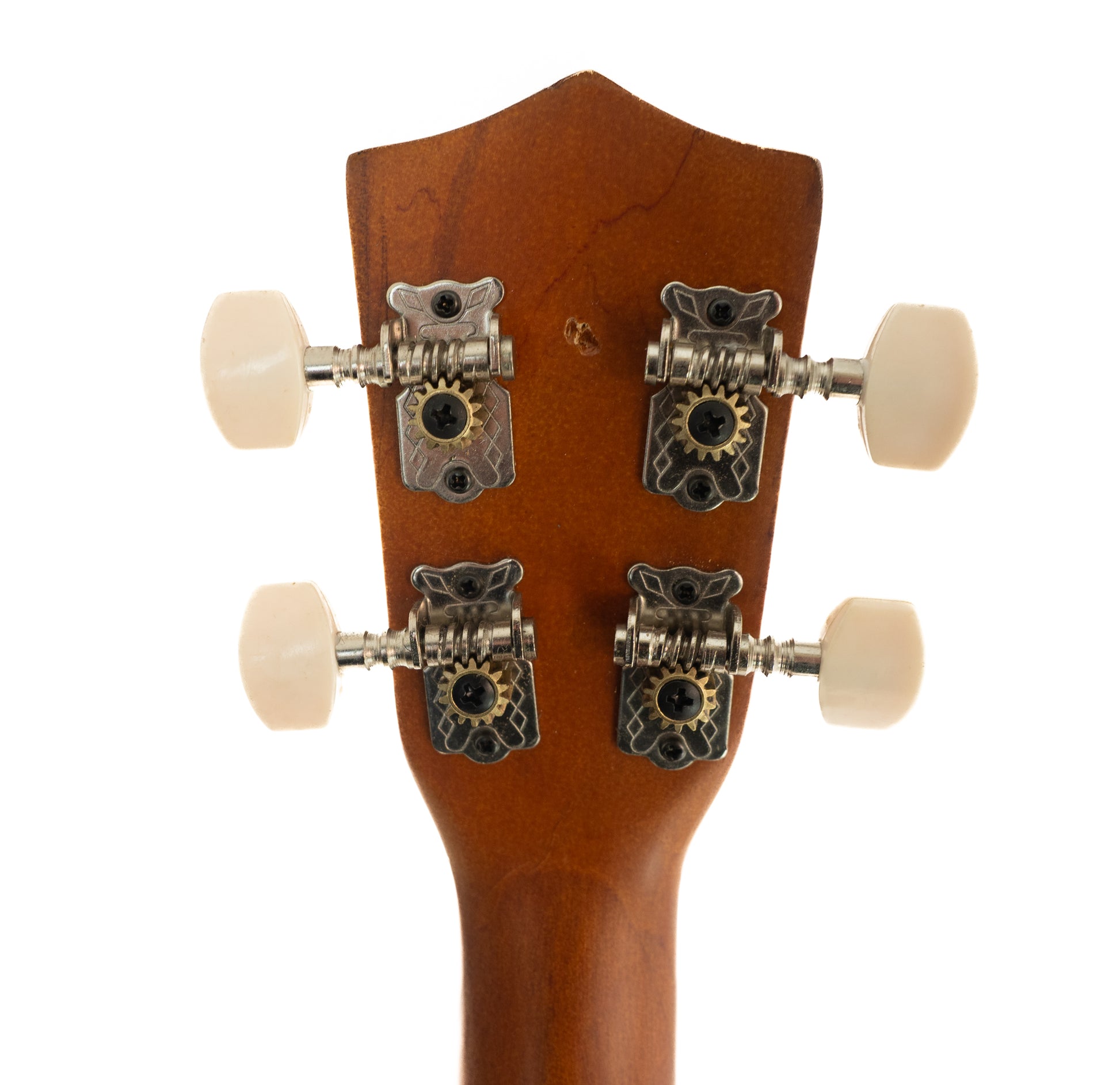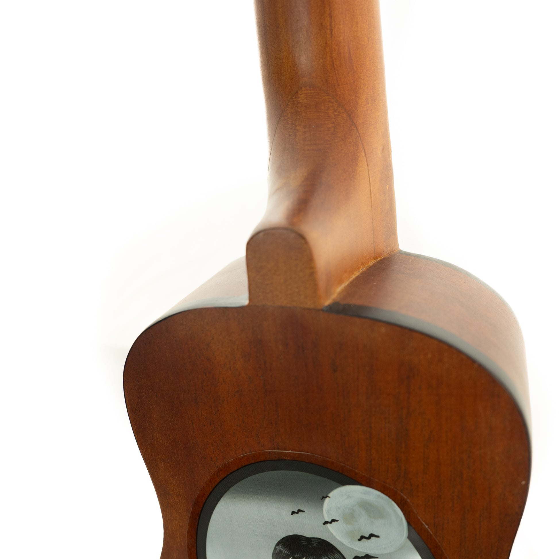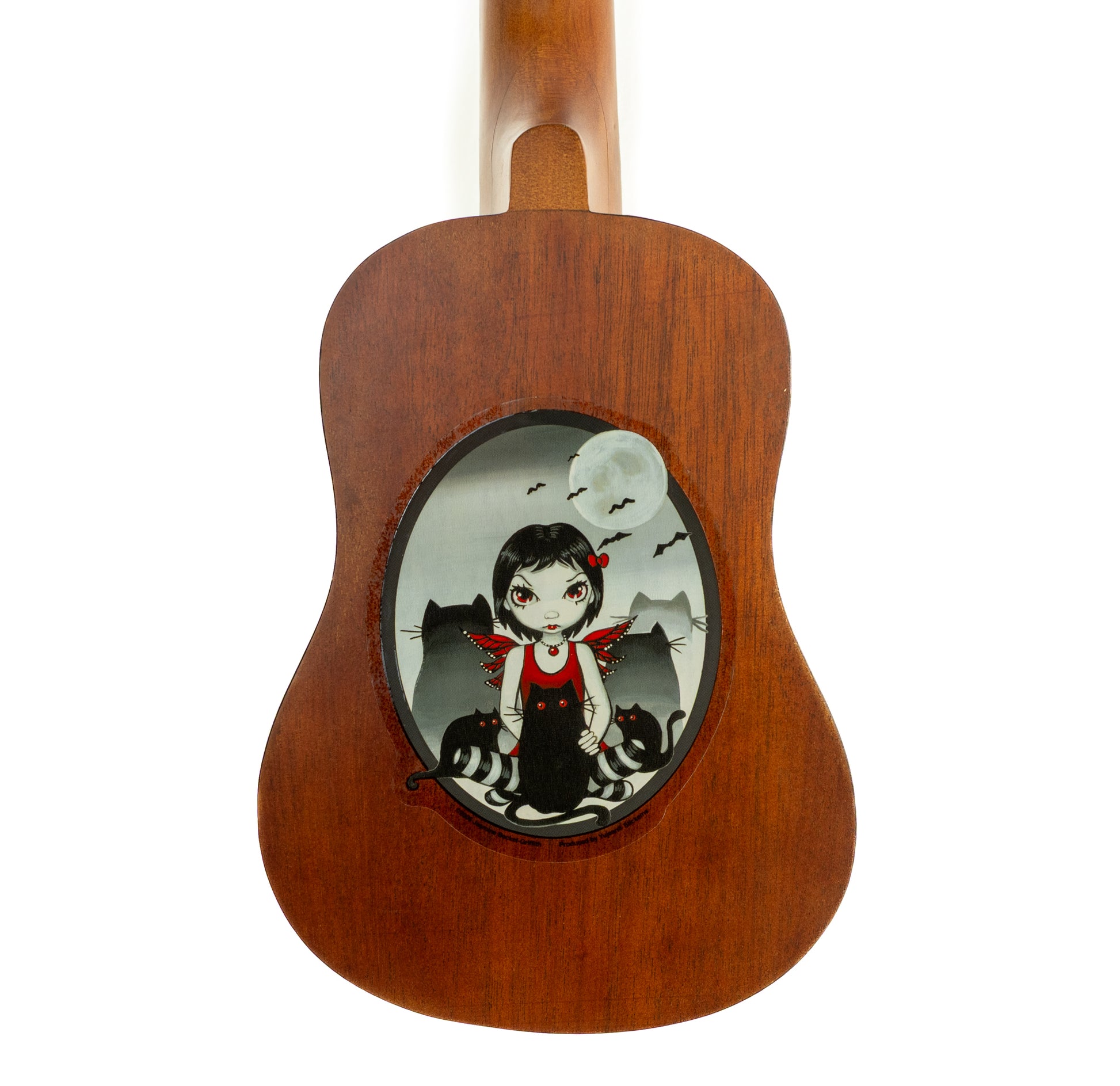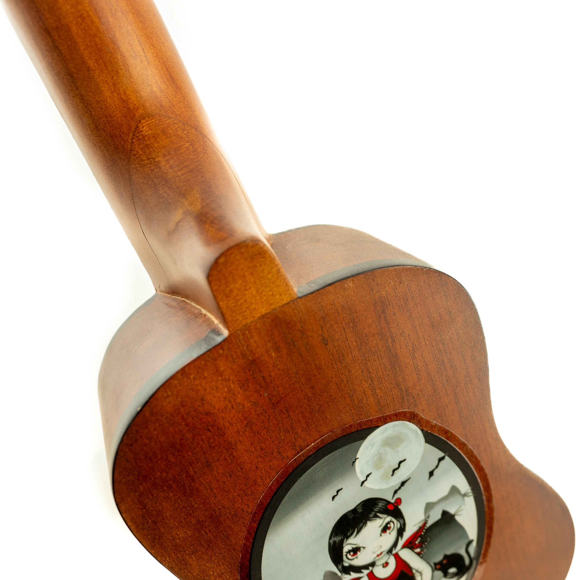 Here is a nice playing/sounding ukulele that tunes up well. All notes play normally and the action is nice. Ships with a nice padded gigbag. It has some finish blemishes that mostly look like factory blems. It has some light chipping here and there with the worst blem being an indention on the back of the headstock. The "Wednesday" style Betty Boop sticker on the back of the headstock is in good condition.