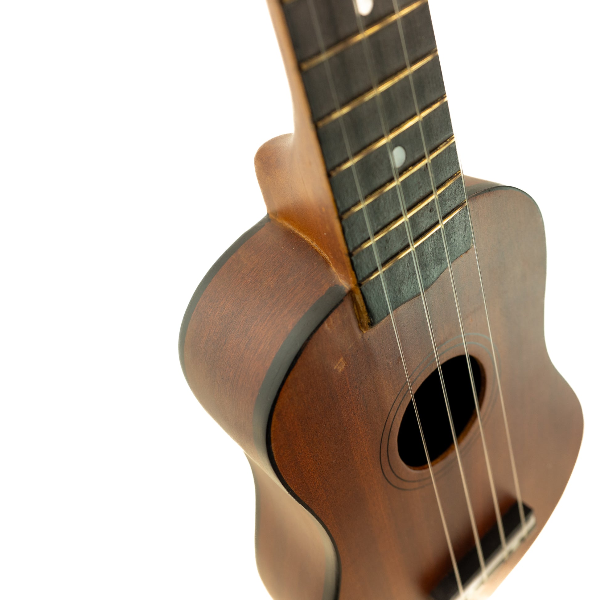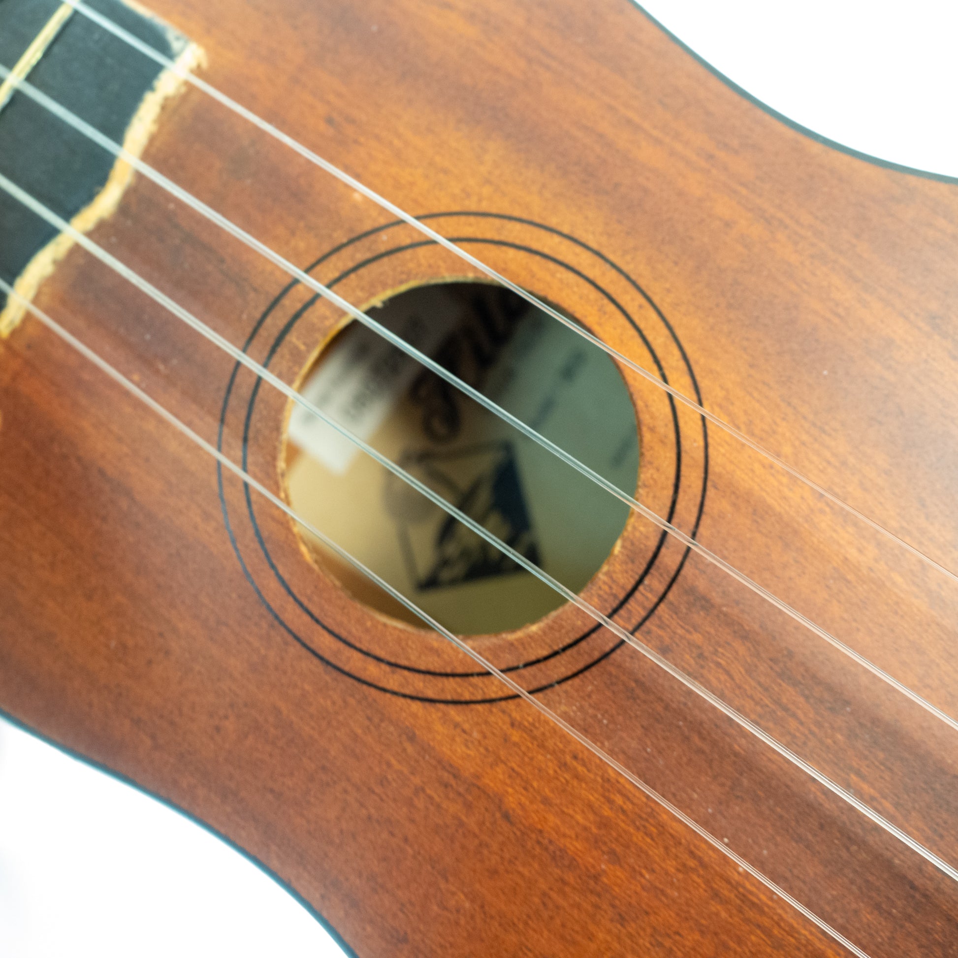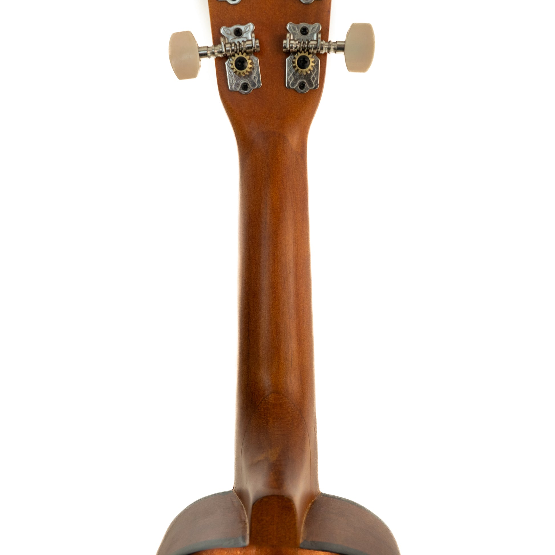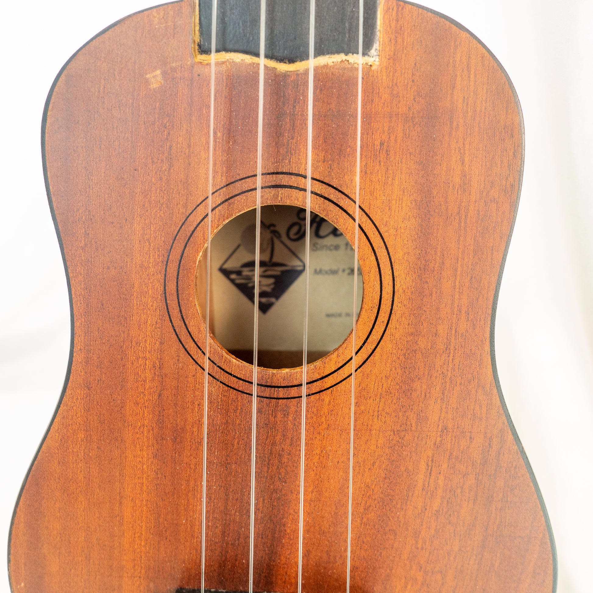 Here is a nice playing/sounding ukulele that tunes up well. All notes play normally and the action is nice. Ships with a nice padded gigbag. It has some finish blemishes that mostly look like factory blems. It has some light chipping here and there with the worst blem being an indention on the back of the headstock. The "Wednesday" style Betty Boop sticker on the back of the headstock is in good condition.