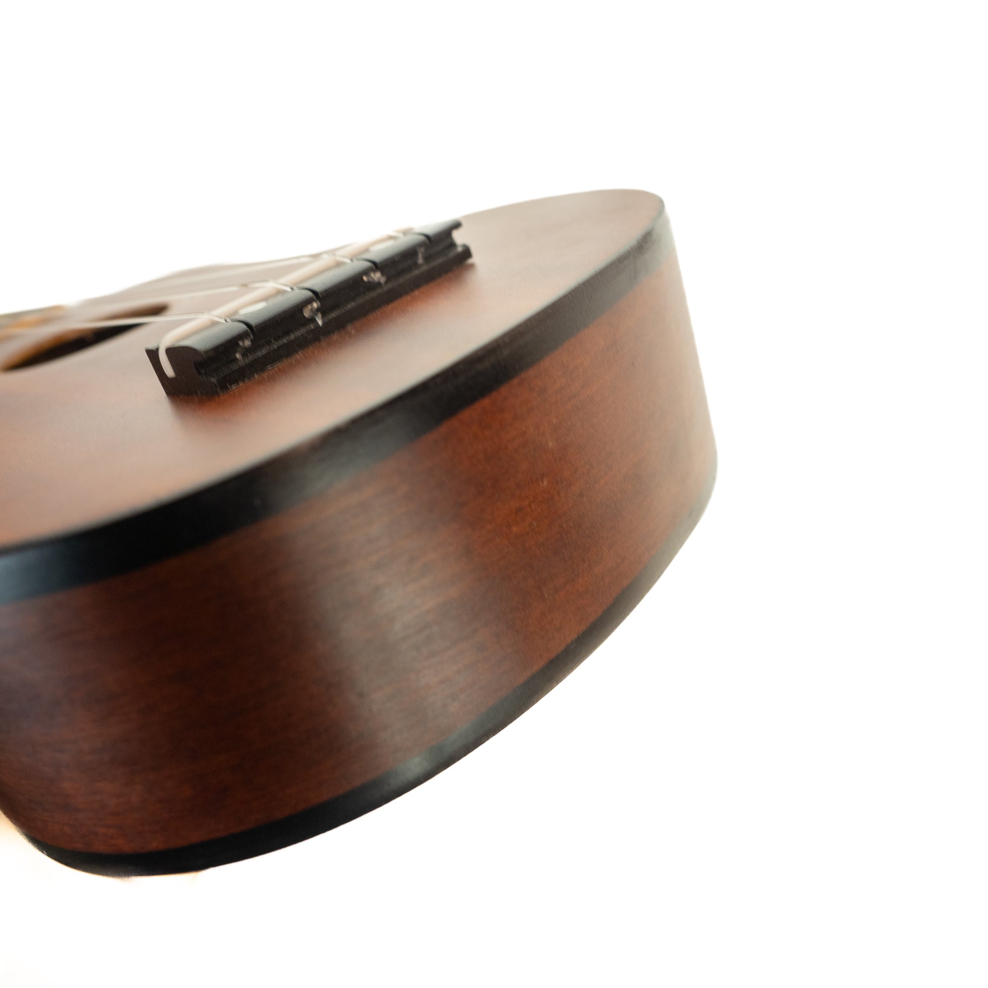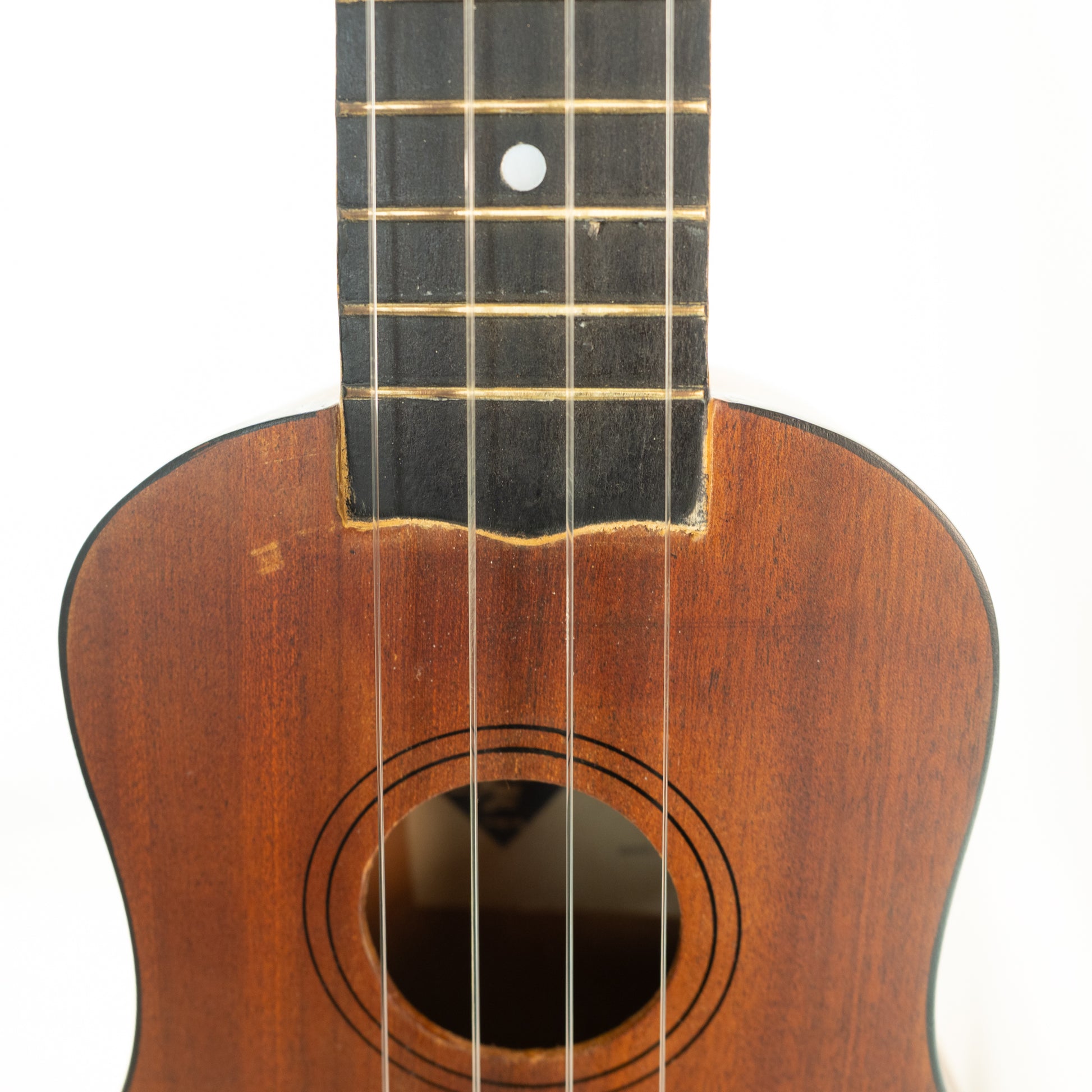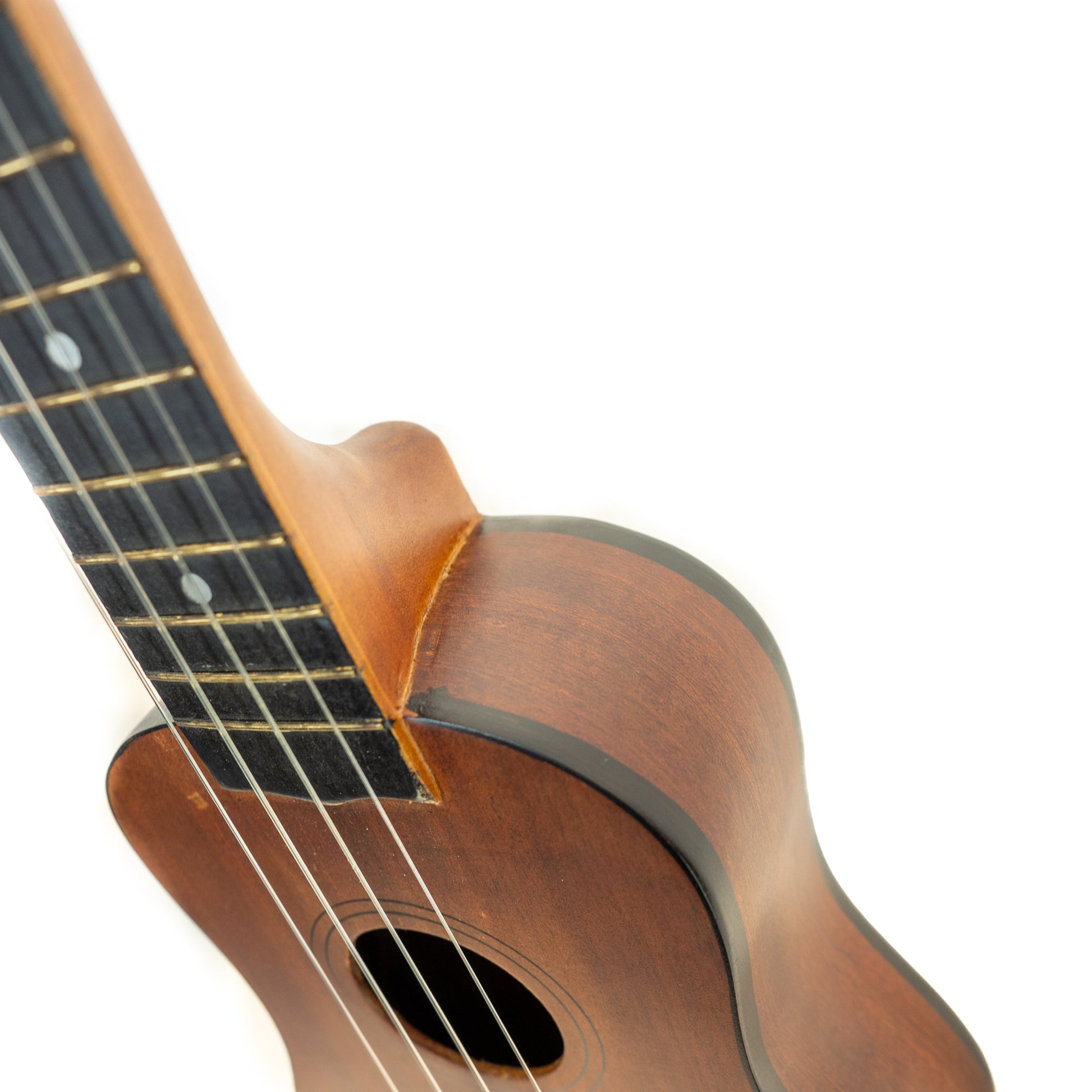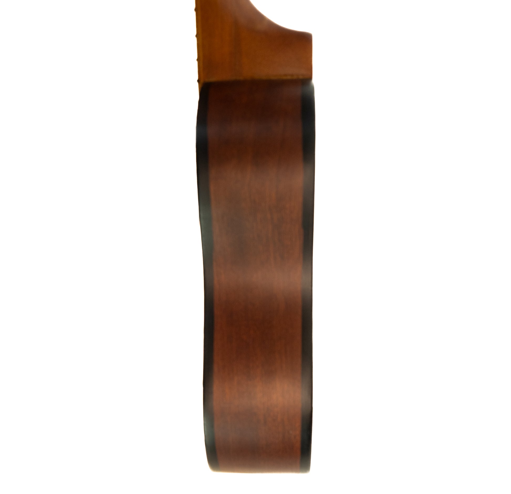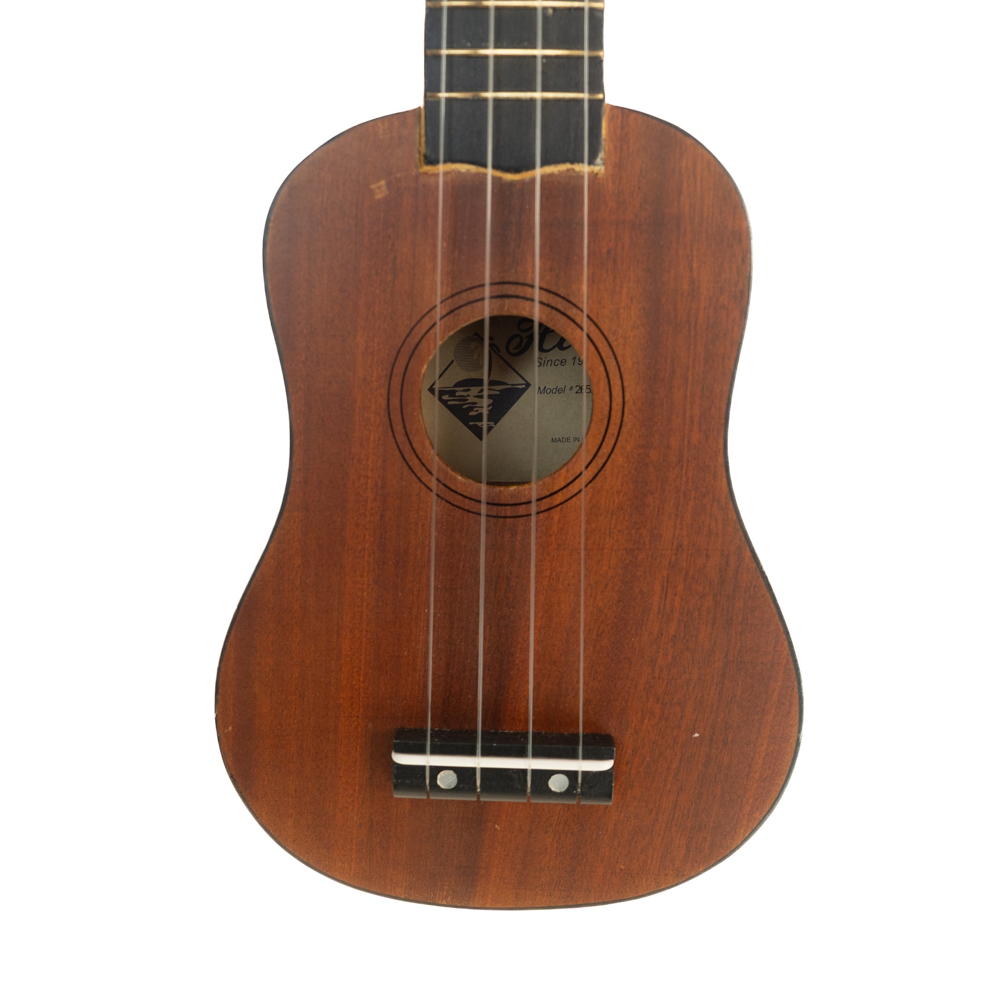 Here is a nice playing/sounding ukulele that tunes up well. All notes play normally and the action is nice. Ships with a nice padded gigbag. It has some finish blemishes that mostly look like factory blems. It has some light chipping here and there with the worst blem being an indention on the back of the headstock. The "Wednesday" style Betty Boop sticker on the back of the headstock is in good condition.