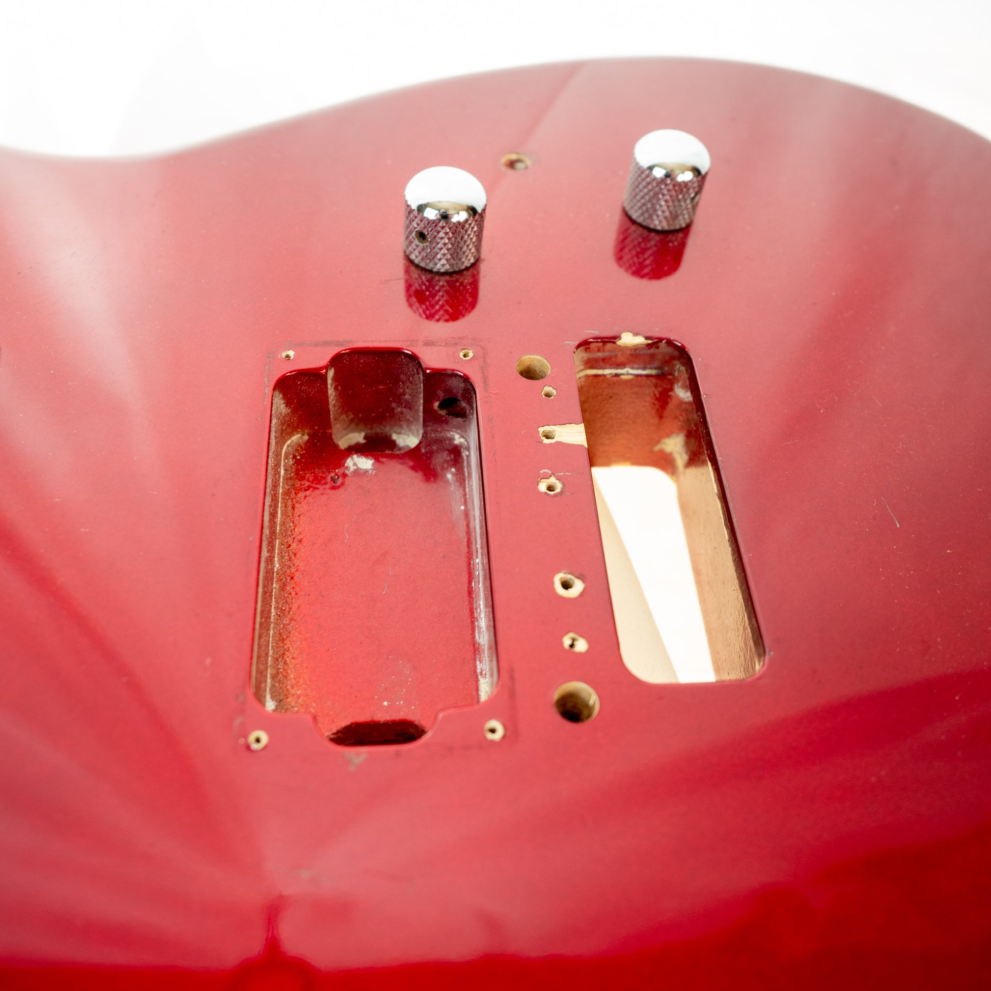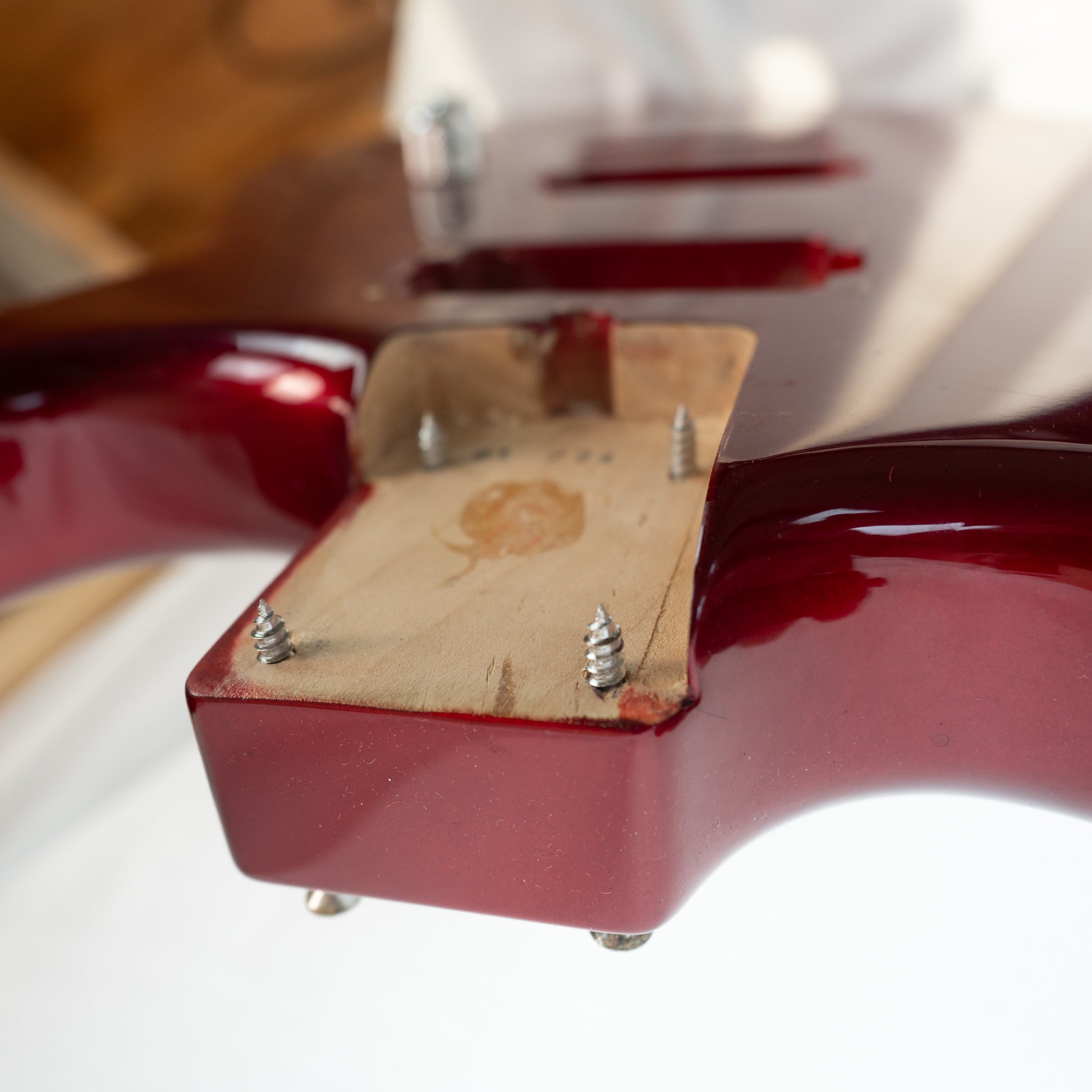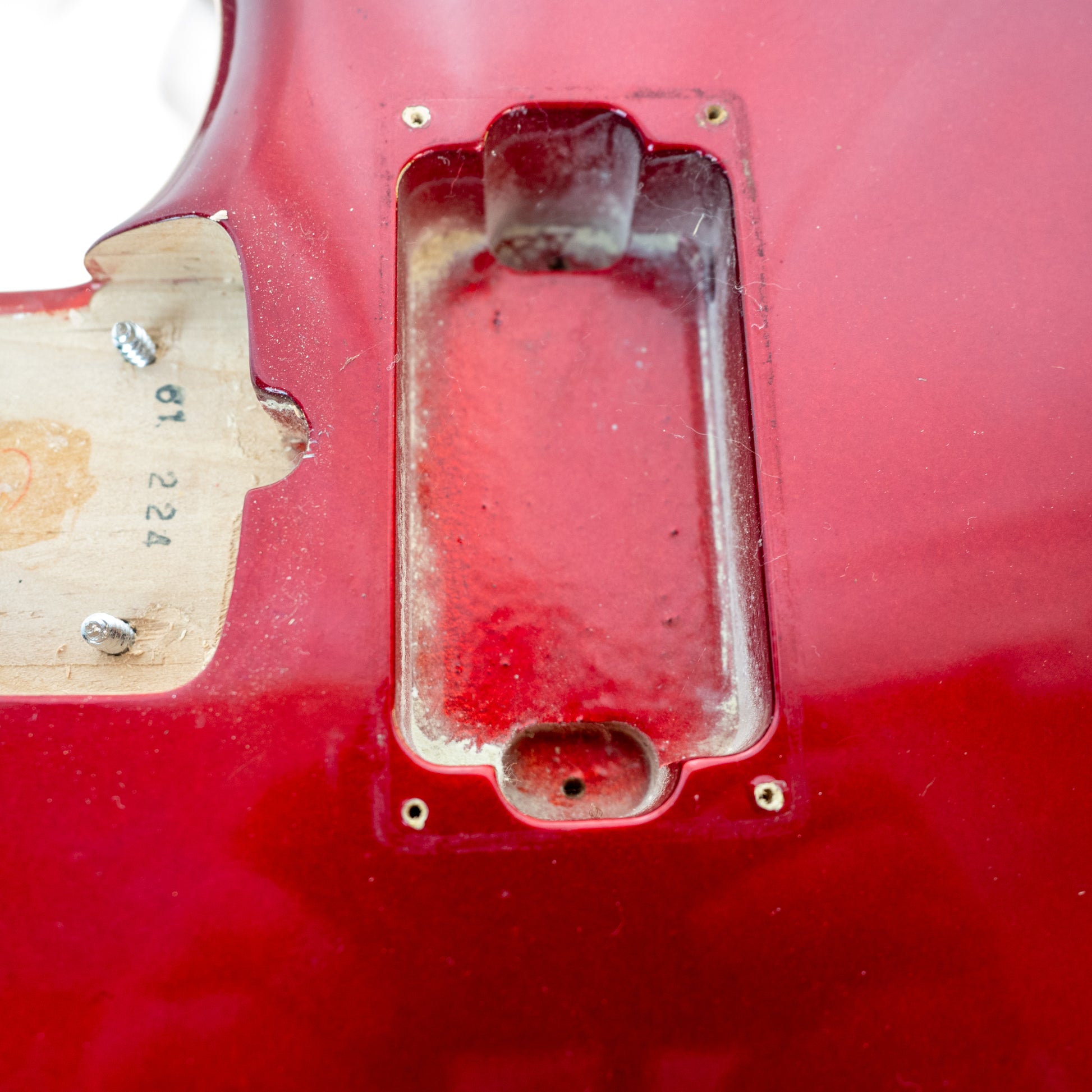 Our guess on the body was from reverse image look up. If anyone with further knowledge could opine, we would very much appreciate that. It's in good condition, no serious damage, but it does have a number of scratches, especially on the back where there are signs of belt rash. One of the pictures of the neck pocket has a streak in it that looks like a crack. There are no cracks or serious damage, but there are a couple of paint/wood chips near the bridge opening. The weight is 4lbs, 15 oz. It measures 16 inches long, lower bout, 13" lower bout, 11.5" upper bout horn to horn. The neck pocket is 56.58mm wide via caliper. The body is 46mm thick near the rear strap button. Stamp in the neck pocket appears to say "61 224". Fits our Chandler neck listed at the same time and sold separately.