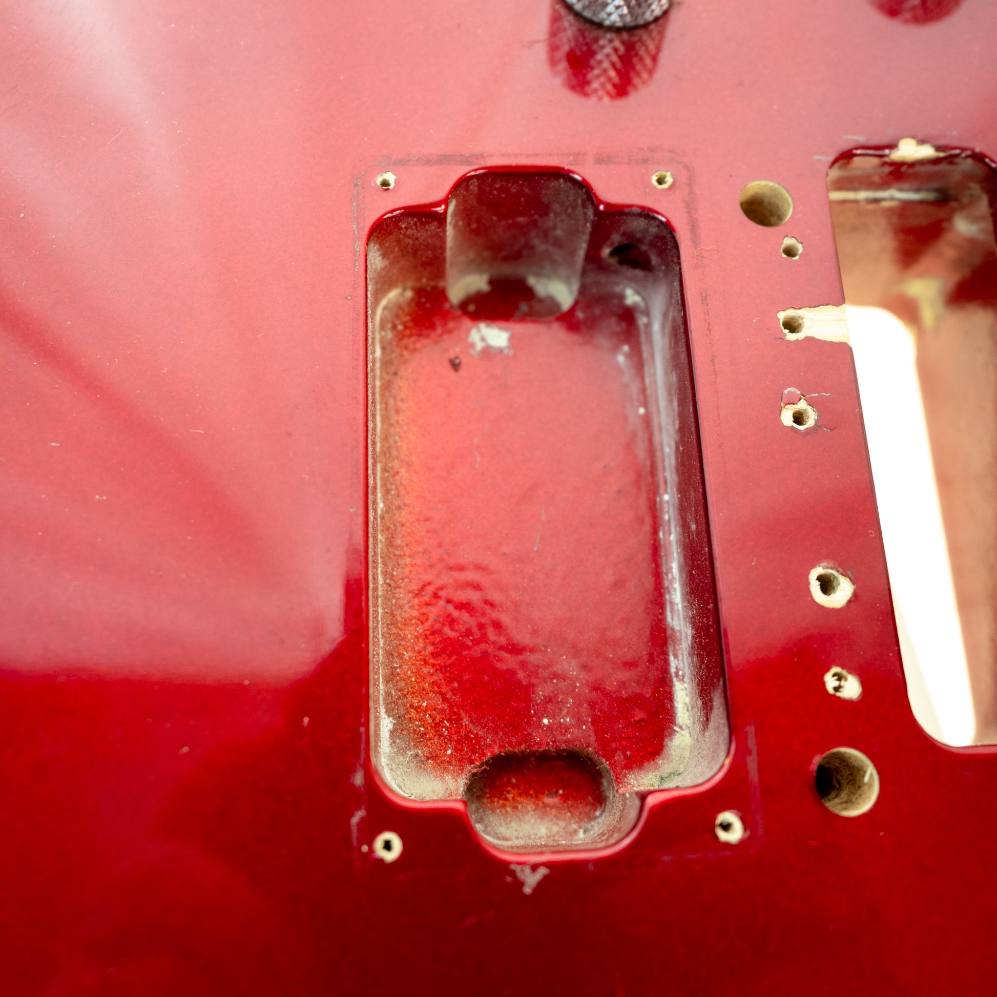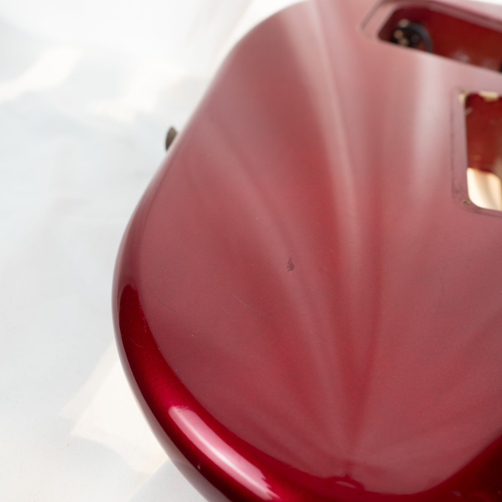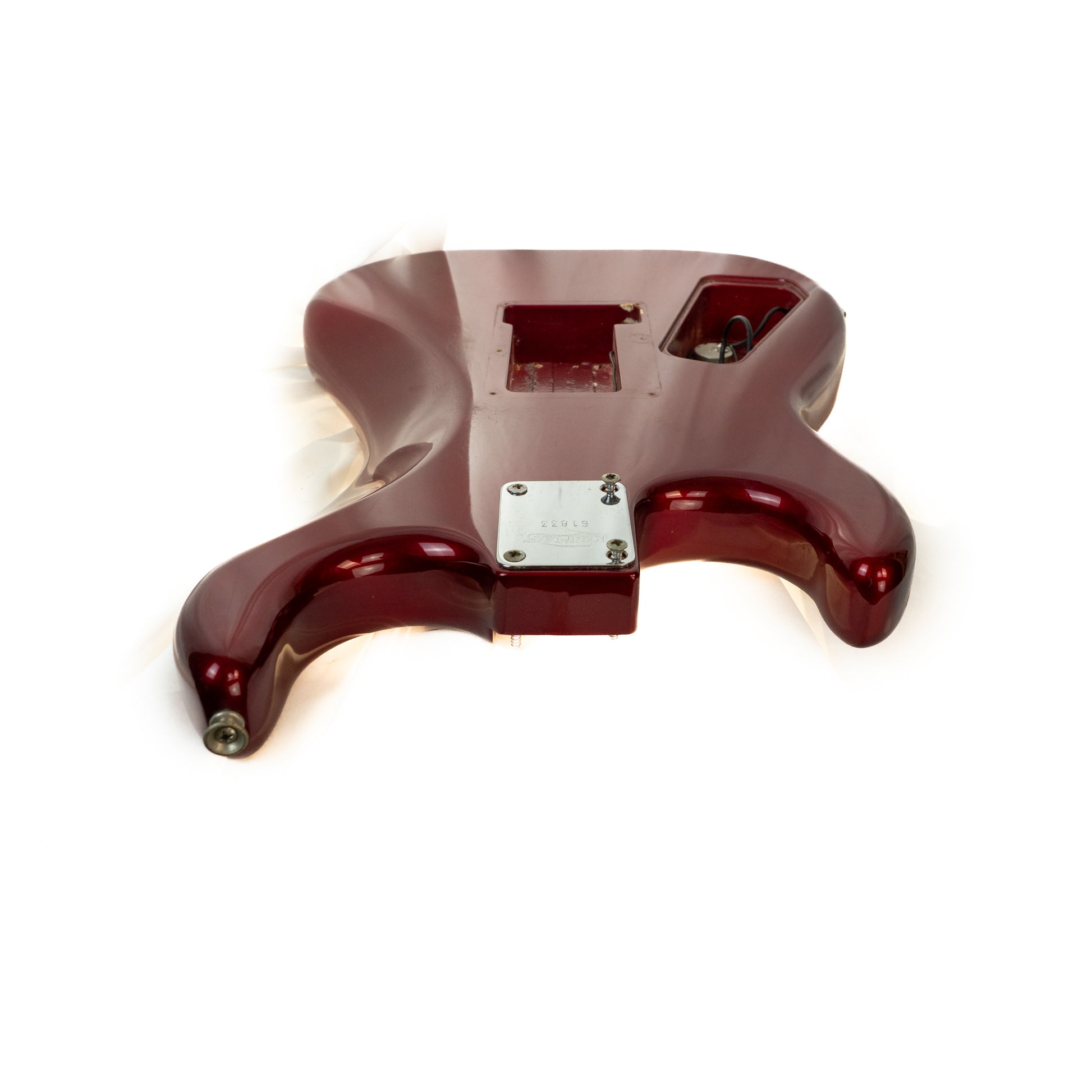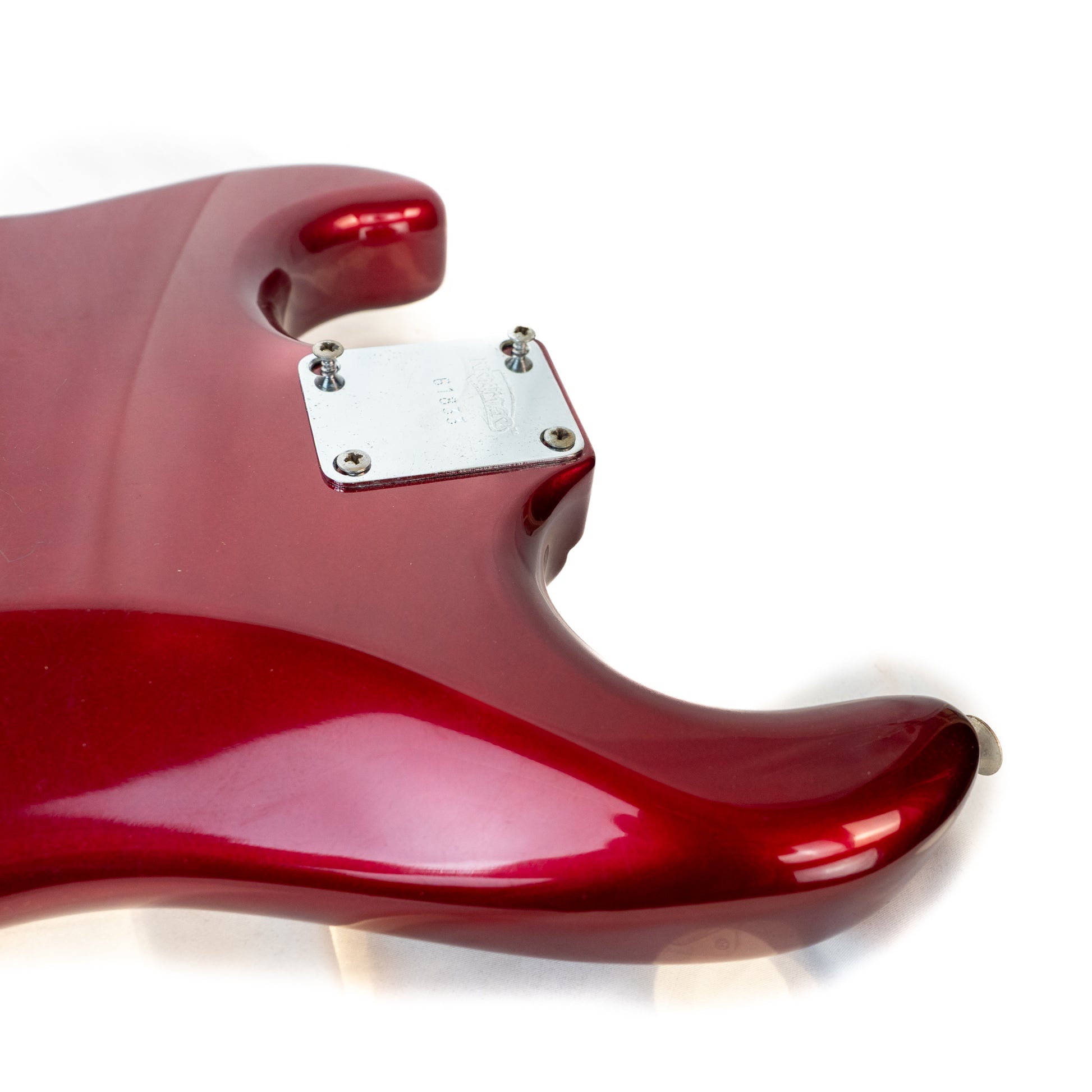 Our guess on the body was from reverse image look up. If anyone with further knowledge could opine, we would very much appreciate that. It's in good condition, no serious damage, but it does have a number of scratches, especially on the back where there are signs of belt rash. One of the pictures of the neck pocket has a streak in it that looks like a crack. There are no cracks or serious damage, but there are a couple of paint/wood chips near the bridge opening. The weight is 4lbs, 15 oz. It measures 16 inches long, lower bout, 13" lower bout, 11.5" upper bout horn to horn. The neck pocket is 56.58mm wide via caliper. The body is 46mm thick near the rear strap button. Stamp in the neck pocket appears to say "61 224". Fits our Chandler neck listed at the same time and sold separately.