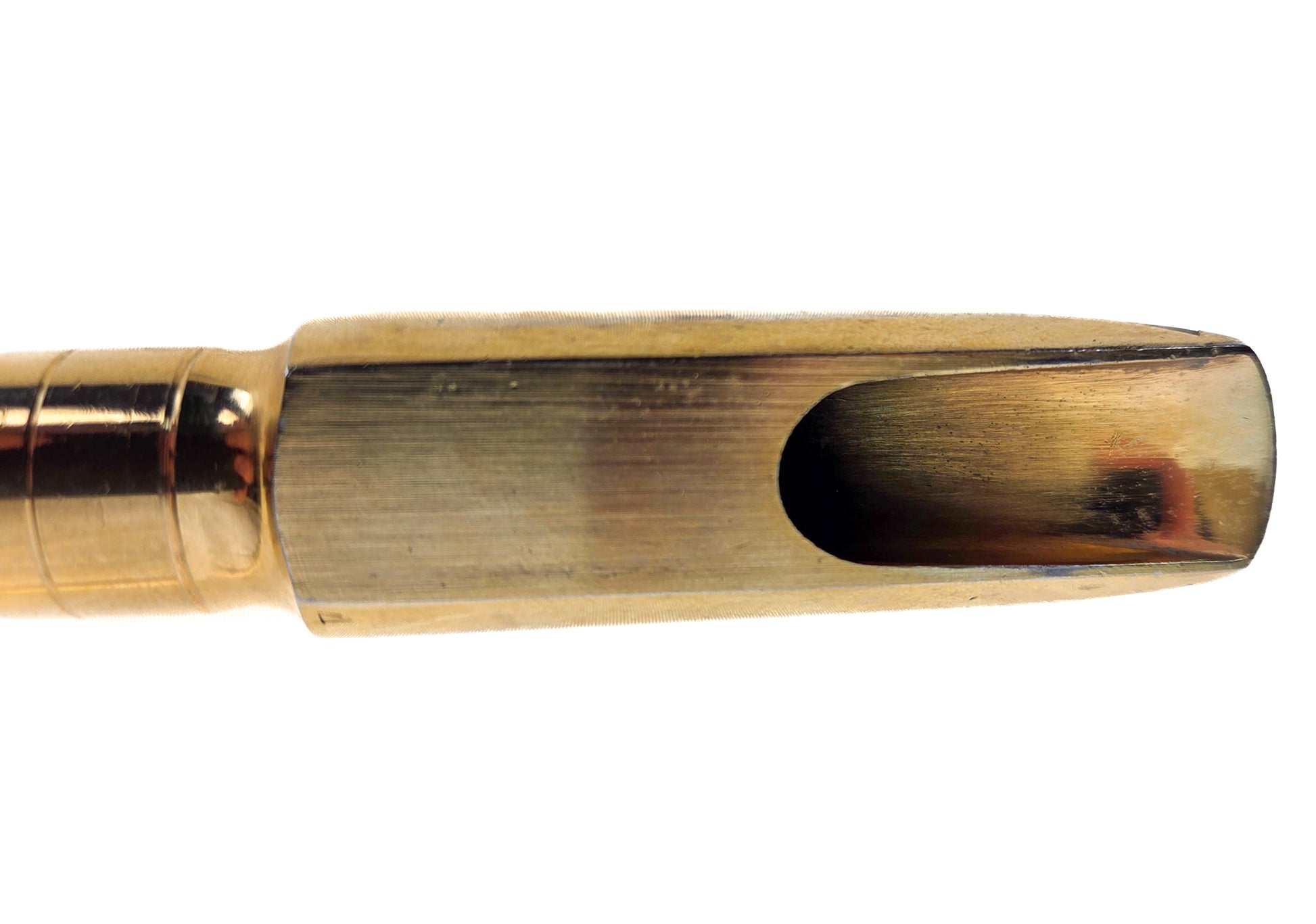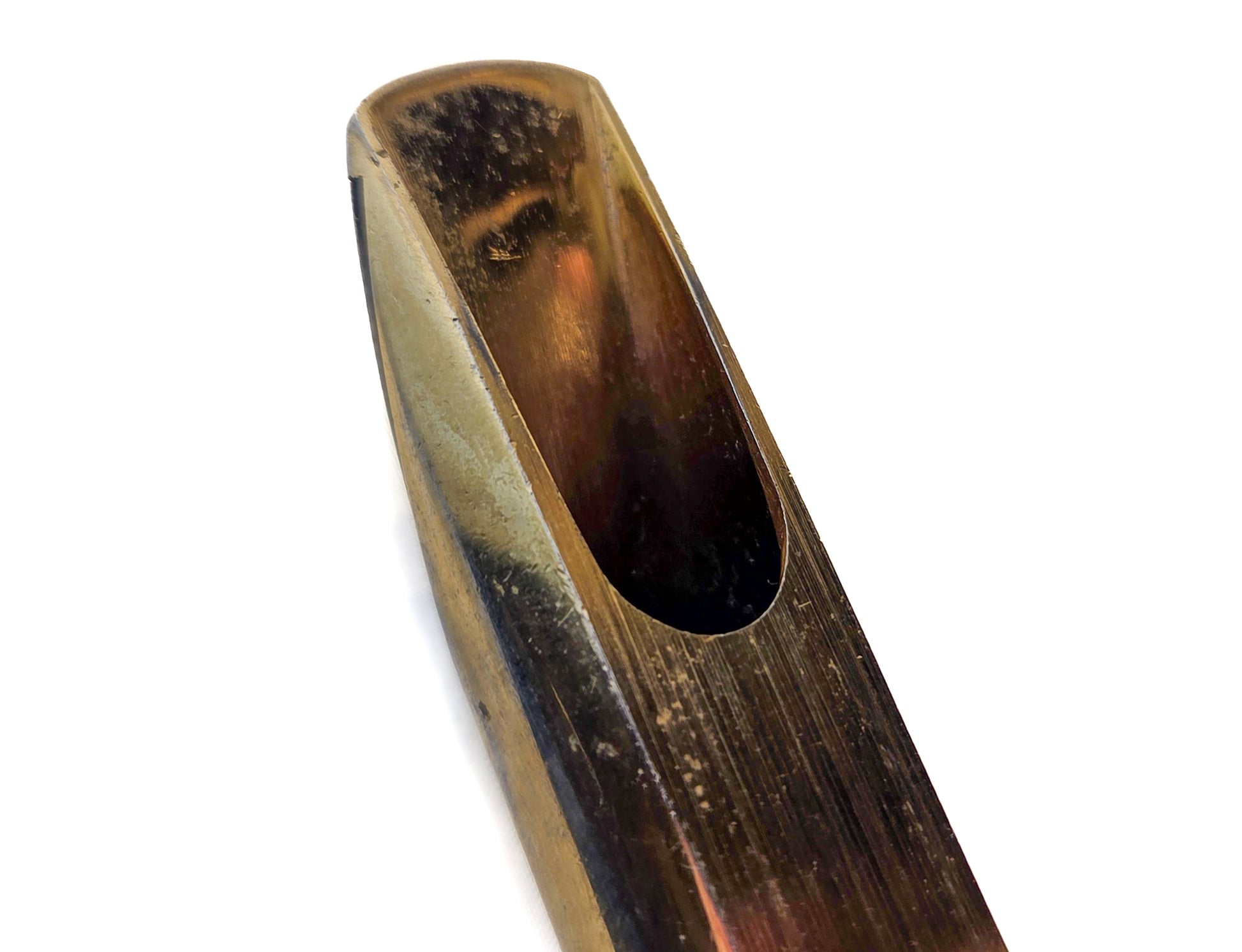 Not the cleanest mouthpiece in the world, but a good candidate for refacing to your desired spec. As the pictures show, there are scratches and finish flaws throughout, very light dings on the face, but no serious damage to our eyes. Of course, a top pro repair tech could tell more and describe this better.